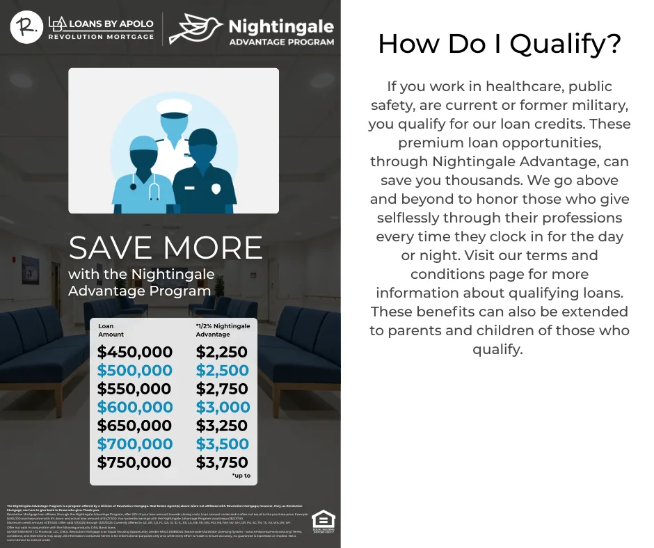 The Nightingale Advantage Program is here to help! Utilize this program built for healthcare workers to save .5% of the loan amount in closing costs – up to $3,750* – when buying your primary residence. Click here for details.